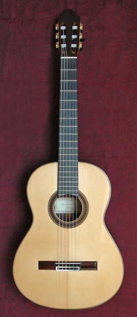 table : Epicéa allemand dos & éclisses : Palissandre Indien diapason : 650mm. largeur au sillet de tête : 52 mm. finition : vernis au tampon / gomme laque fait main